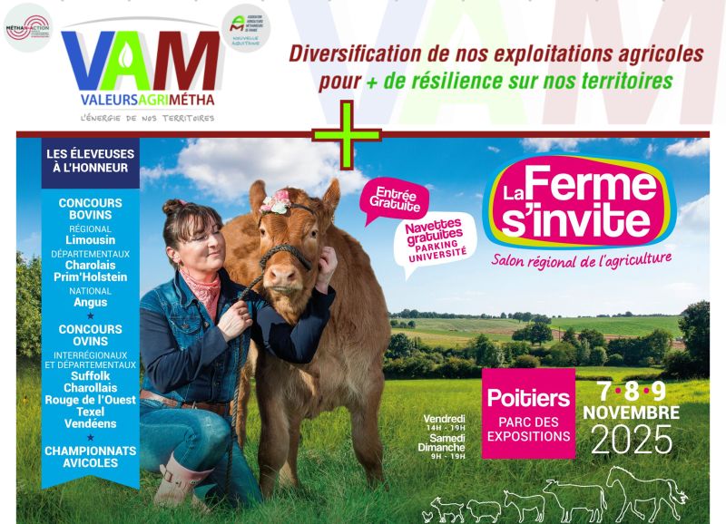 𝗗𝘂 𝟳 𝗮𝘂 𝟵 𝗻𝗼𝘃𝗲𝗺𝗯𝗿𝗲, l’association régionale Valeurs Agri Métha (VAM) sera présente au salon 𝗟𝗮 𝗙𝗲𝗿𝗺𝗲 𝘀’𝗶𝗻𝘃𝗶𝘁𝗲 𝗮̀ 𝗣𝗼𝗶𝘁𝗶𝗲𝗿𝘀, le grand rendez-vous agricole de la Vienne.